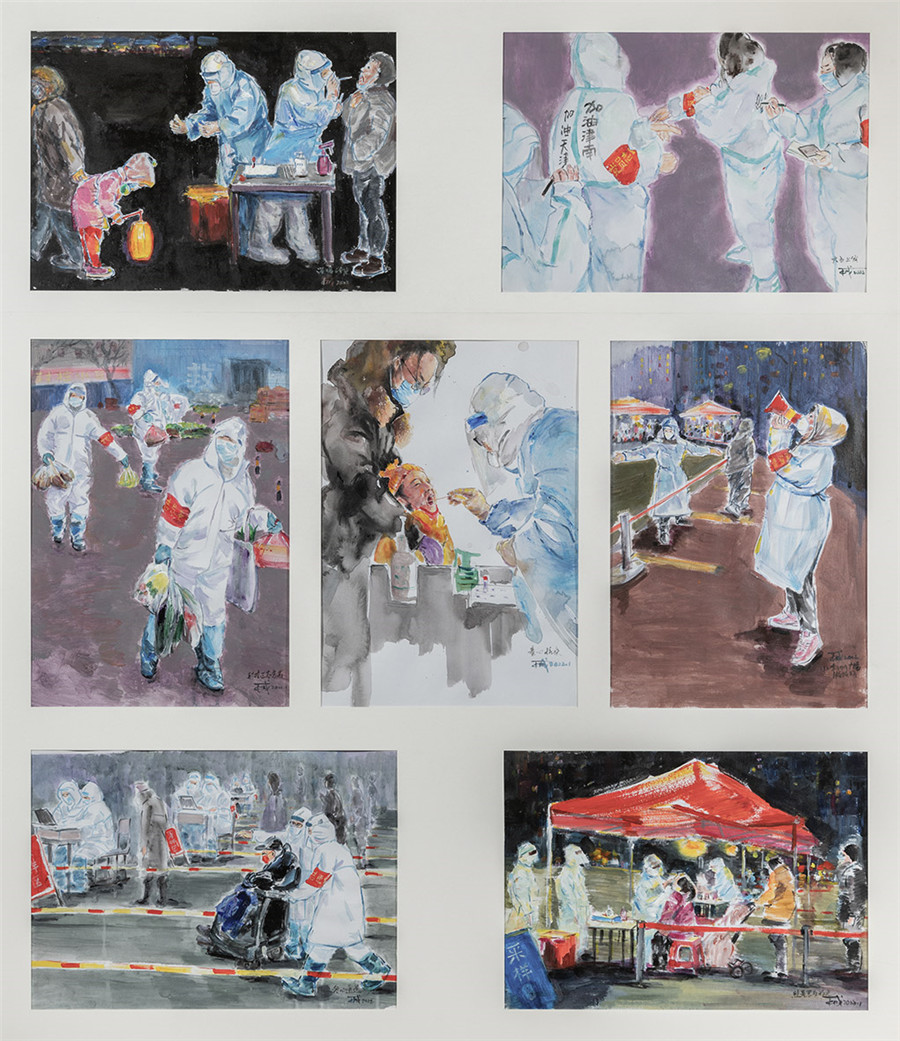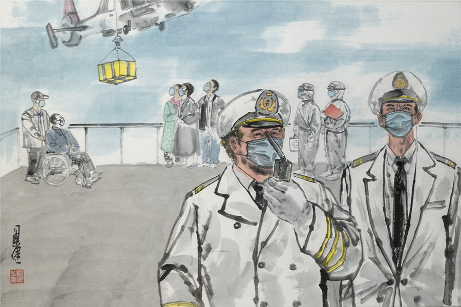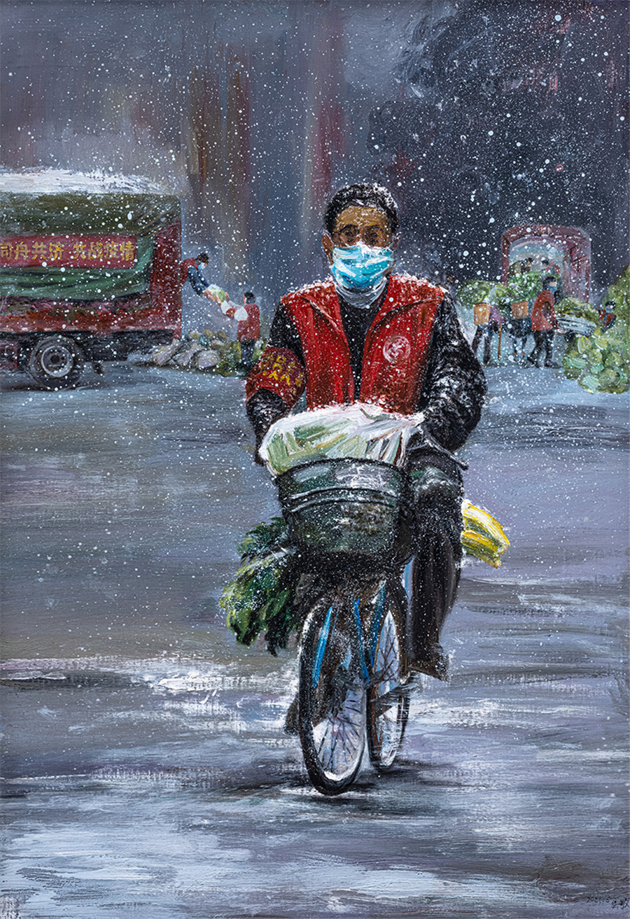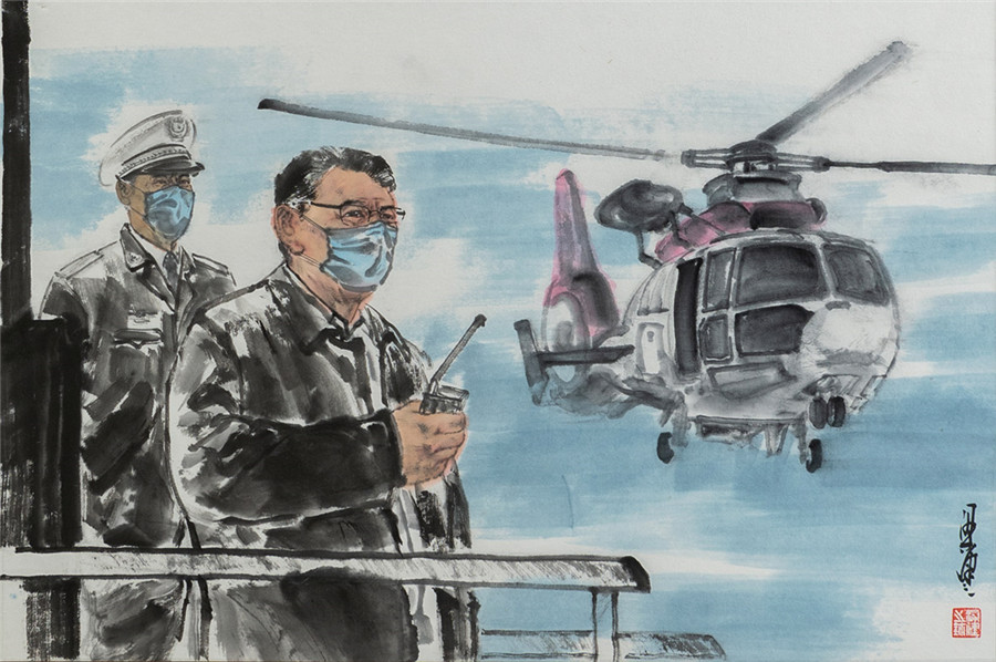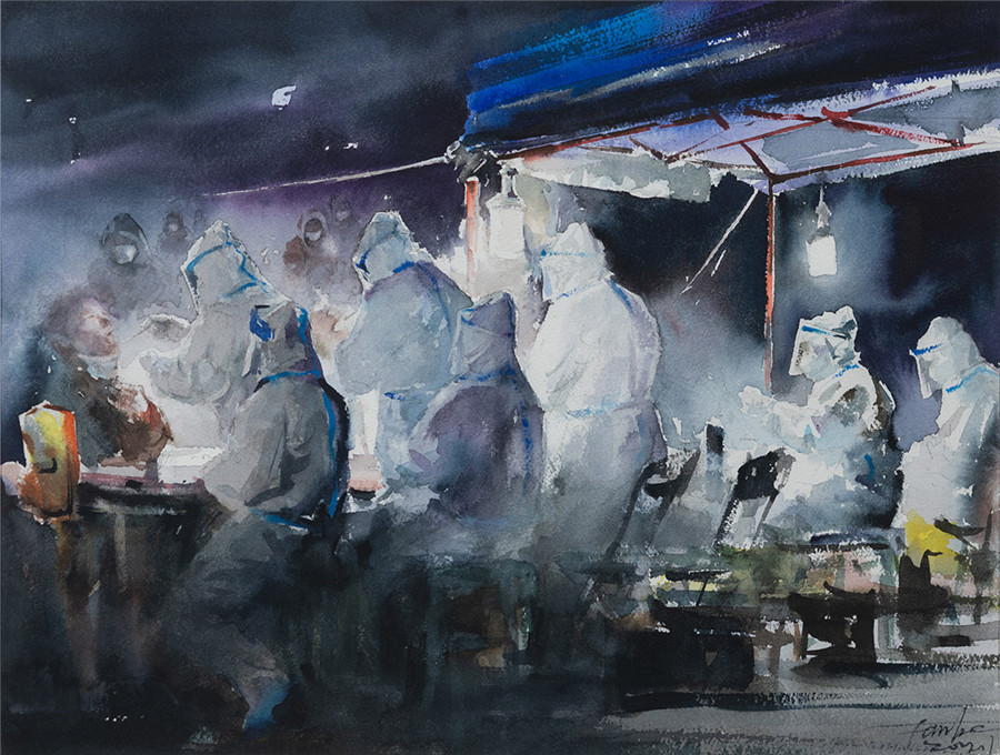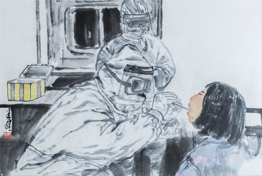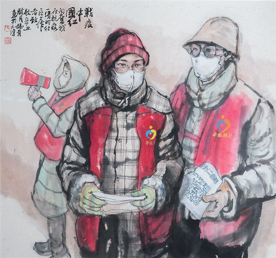 國畫《“戰(zhàn)疫”中國紅》張福有