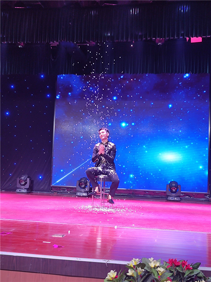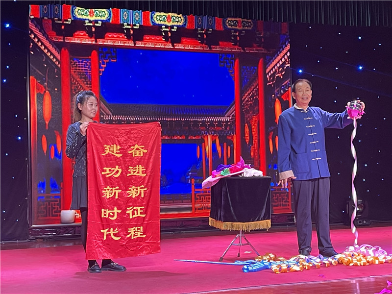 臧元龍表演現(xiàn)代魔術《魔術夢》 觀眾王女士在臺下看得饒有興致,還參與了魔術互動。王女士高興地說:“看了這些生動活潑、充滿正能量的文藝節(jié)目,讓人心情愉悅又深感振奮。”