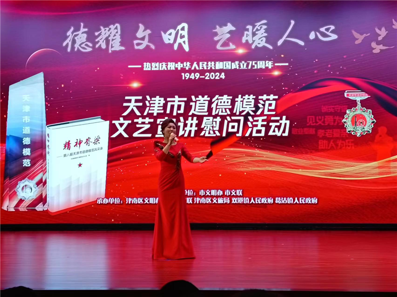 為深入貫徹落實黨的二十屆三中全會精神和習(xí)近平總書記視察天津重要講話精神,喜迎新中國成立75周年,營造隆重?zé)崃业臍g慶氛圍,展現(xiàn)天津崇德向善、見賢思齊的精神氣質(zhì)和德者受尊、德者有譽的價值導(dǎo)向,引導(dǎo)廣大市民群眾厚植愛國主義情懷、培育良好道德風(fēng)尚,由市文聯(lián)、市文明辦主辦,市文藝志愿者協(xié)會、津南區(qū)文明辦承辦的“德耀文明 藝暖人心”天津市道德模范文藝宣講慰問活動于近日在津南區(qū)雙港鎮(zhèn)文體中心舉行。來自天津市的道德模范、身邊好人與群眾代表齊聚一堂,在豐富多彩的文藝演出中,致敬道德之美,禮贊道德榮光。