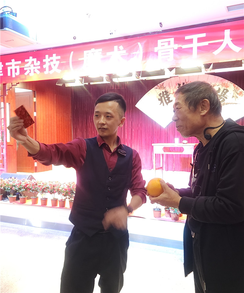 楊小磊授課 10月29日,在河西文化館進行了培訓成果展示和專家輔導。培訓班學員朱怡璇表演了魔術《恭喜發(fā)財》,于明茹表演了戲法《羅圈獻彩》,張建亮表演了戲法《平升三級》,郭曉天表演了魔術《魔手神采》,李小靳表演了魔術《五彩繽紛》,劉光熠表演了魔術《紙牌奇跡》。針對每個人的表演,天津市雜協(xié)副主席楊小磊及老藝術家肖桂森、郭玉文、汪玉英、路素卿、只德福等進行了點評和指導,專家們還現(xiàn)場進行了表演示范。