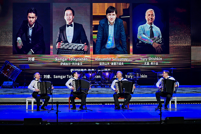 國際大師的加盟為演出注入多元活力。意大利爵士手風(fēng)琴先驅(qū)Renzo Ruggieri帶來即興演奏,指尖與琴鍵的碰撞盡顯藝術(shù)張力;俄羅斯功勛演奏家、拉赫瑪尼諾夫音樂學(xué)院教授尤里•希什金演繹《西伯利亞敘事曲》,用濃郁民族色彩勾勒異域風(fēng)光。壓軸登場的手風(fēng)琴四重奏《頓河狂想曲》,由俄羅斯手風(fēng)琴大師尤里•希什金教授、天津音樂學(xué)院劉睿副教授、俄羅斯亞歷山大•謝里萬諾夫教授、哈薩克斯坦薩姆加爾•托爾金漢教授共同演繹,精湛技藝與默契配合將現(xiàn)場氣氛推向高潮。