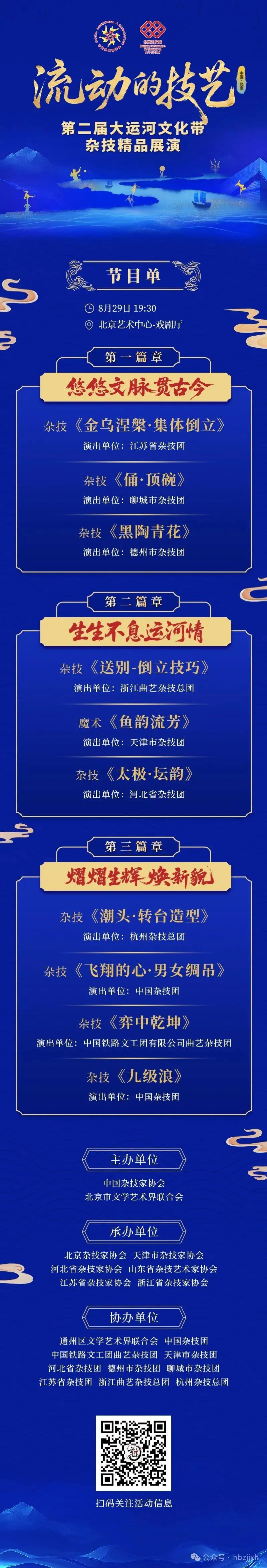 8月29日,第二屆“流動的技藝”大運(yùn)河文化帶雜技精品展演將在北京藝術(shù)中心·戲劇廳隆重舉行。來自北京、天津、河北、山東、江蘇、浙江雜技家協(xié)會的九大頂尖院團(tuán)將帶來優(yōu)秀節(jié)目參加展演,歡迎廣大會員和雜技愛好者到場觀看!