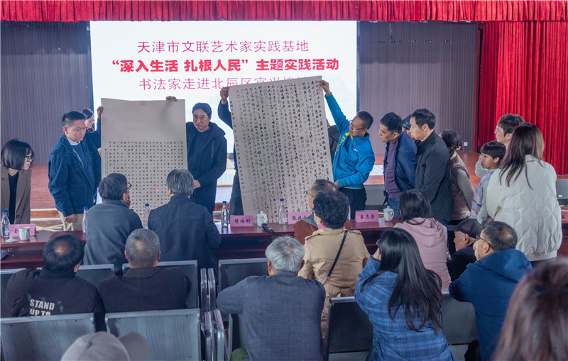 10月23日,天津市文聯(lián)藝術(shù)家實(shí)踐基地“深入生活 扎根人民”主題實(shí)踐活動(dòng)在北辰區(qū)宜興埠鎮(zhèn)文體中心舉行。中國(guó)書協(xié)副主席、天津市文聯(lián)副主席、天津市書協(xié)主席張建會(huì),中國(guó)書協(xié)理事、天津市書協(xié)副主席兼秘書長(zhǎng)楊健君,天津市書協(xié)原副主席、北辰區(qū)書協(xié)主席沈憲民,區(qū)文聯(lián)、宜興埠鎮(zhèn)有關(guān)領(lǐng)導(dǎo)和北辰區(qū)書法骨干以及書法愛好者百余人,參加此次活動(dòng)。