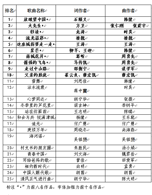天津市精品歌曲創(chuàng)作工程作品征集與“聽見中國聽見你”2025年度優(yōu)秀歌曲推選活動天津地區(qū)選拔工作,得到了廣大詞曲作者的積極參與和大力支持。本次活動共收到原創(chuàng)詞曲作品105首,經(jīng)專家評委認真評審,評選出25首優(yōu)秀作品。其中: • 排名前8位的作品,將獲得報送參加中國音協(xié)“聽見中國聽見你”2025年度優(yōu)秀歌曲推選活動的資格; • 排名前10位的作品,將由天津市音協(xié)予以重點打造,并授予“最佳作品獎”; •排名 11至25位的作品獲“優(yōu)秀作品獎”。 現(xiàn)將評選結(jié)果予以公示。 公示時間:2025年12月22日至12月26日,共5天。 反饋說明:公示期間,任何單位和個人如對公示結(jié)果有異議,均可通過來信、來電方式向天津市音樂家協(xié)會反映。反映情況應實事求是、客觀公正,并請?zhí)峁┱鎸嵭彰奥?lián)系方式以便核實。我會將對反映問題嚴格保密,經(jīng)查實確有問題者,將取消其獲獎資格,并按相關(guān)規(guī)定處理。 受理部門:天津市音樂家協(xié)會 聯(lián)系電話:022—23305682 電子郵箱:tjsyyjxh@163.com 天津市音樂家協(xié)會 2025年12月22日 2025年度天津市精品歌曲創(chuàng)作工程及“聽見中國聽見你”天津地區(qū)推選活動評審結(jié)果公示
