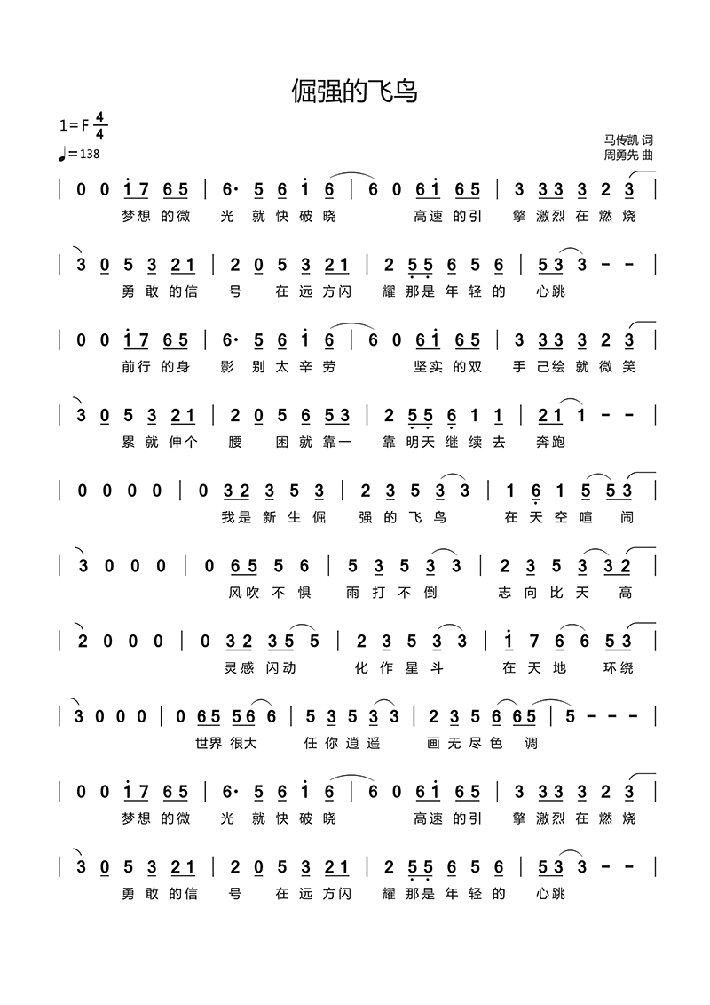 2.歌曲《倔強的飛鳥》 作詞:馬傳凱 作曲:周勇先 演唱:馬六甲、王茜、王旭東、王子騫